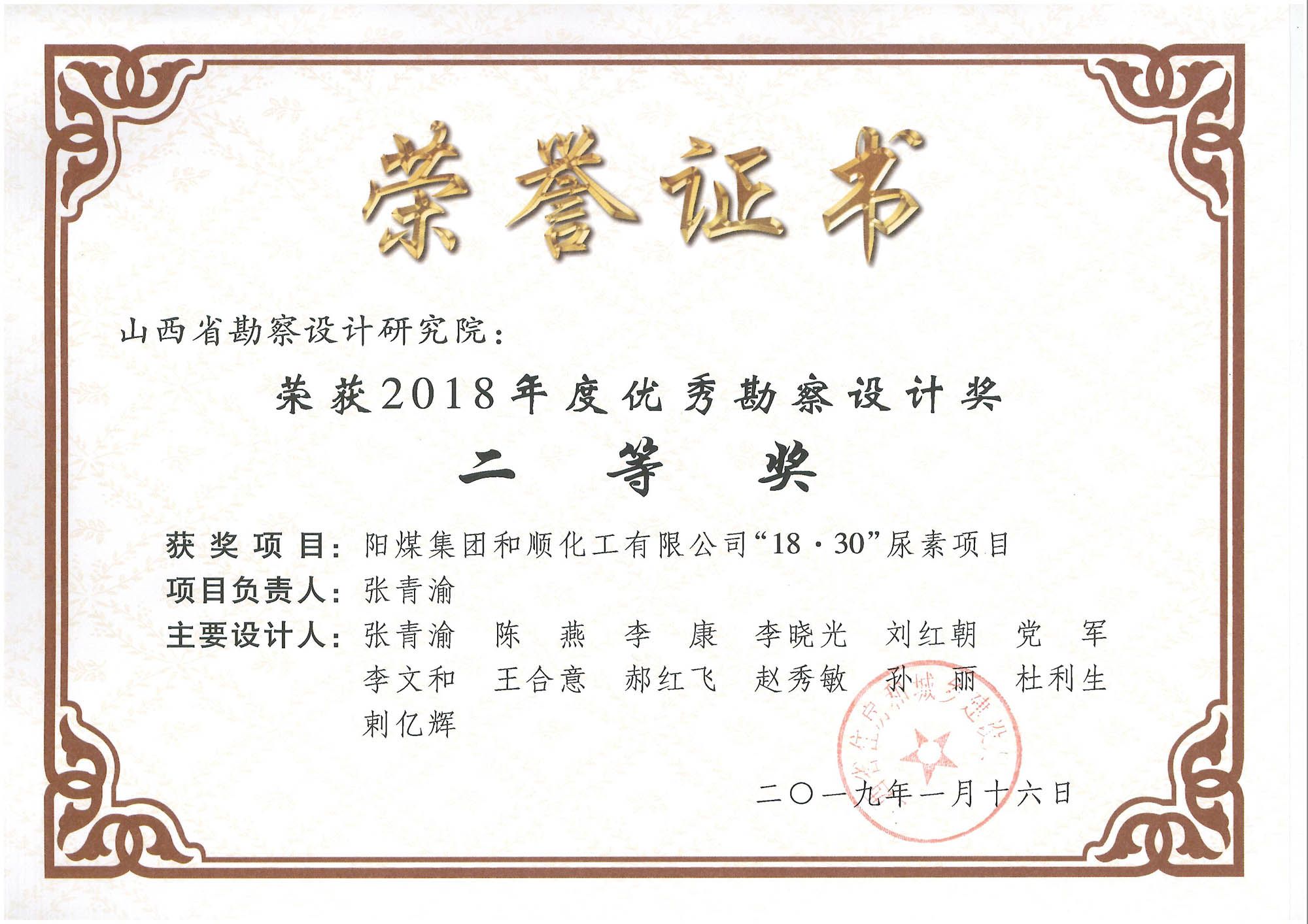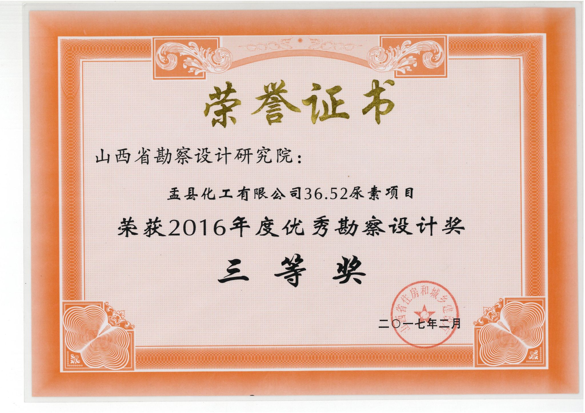 盂县化工36.52尿素项目优秀勘察设计三等奖