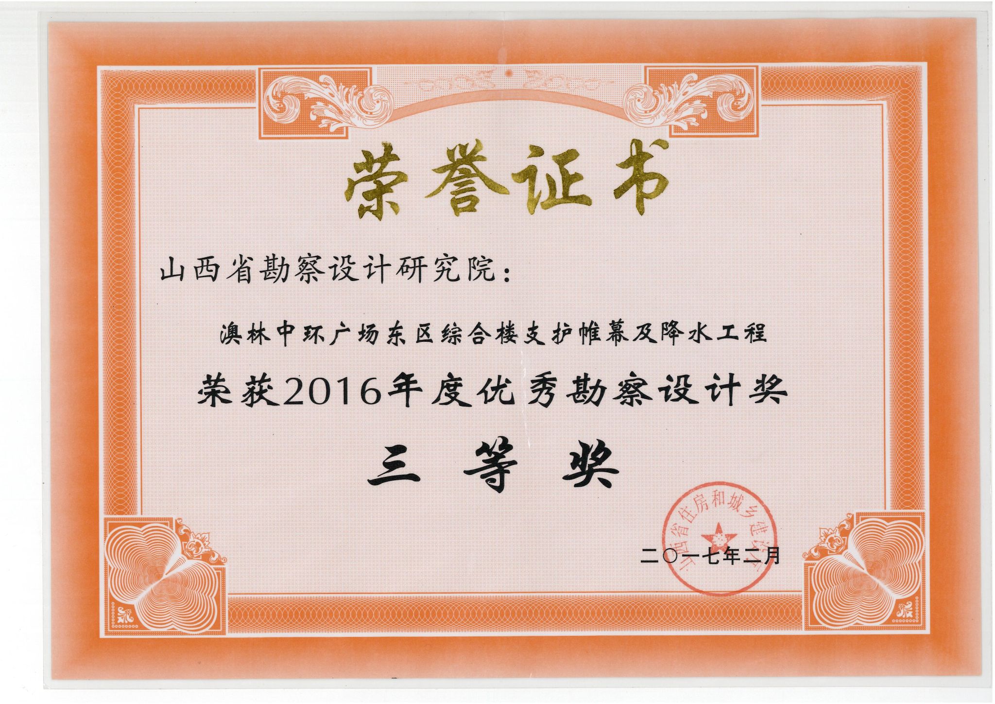 澳林中环广场东区综合楼支护帷幕及降水优秀勘察设计三等奖
